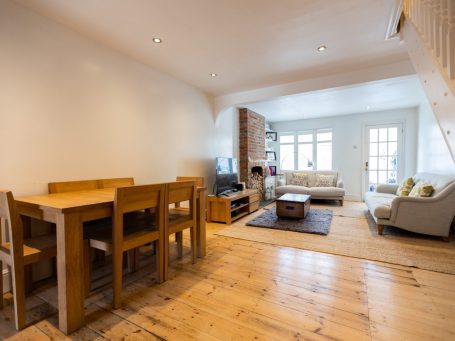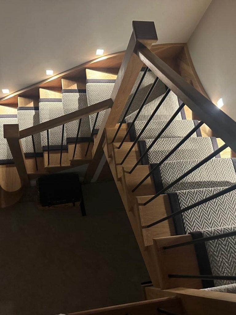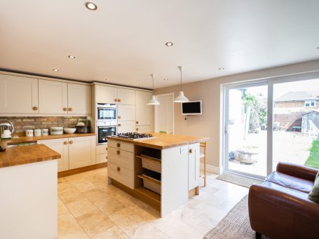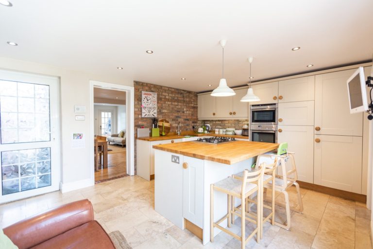 An exciting refurbishment in Hertfordshire. We reconfigured the downstairs and up, removing walls, converting an awkward space into a large Kitchen Diner. Installing a beautiful bespoke oak Kitchen, complimented by a brick effect wall.