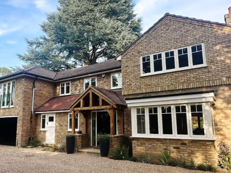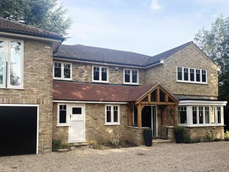 The original front door was tucked awkwardly under a porch. By rebuilding with matching reclaimed bricks, we reconfigured the layout to create space for a downstairs W/C and extend the Boot Room. The front door was repositioned, new staircase installed and a bespoke oak pergola added to create a warm, welcoming entrance. Finally, the outdated brown cladding was replaced with reclaimed brick slips to tie everything together.