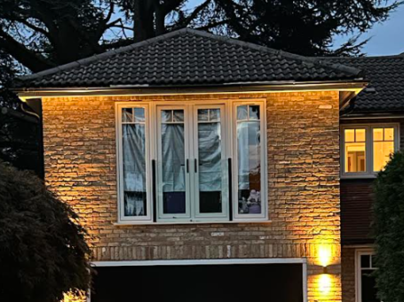 Surrounded by trees, traditional timber windows would have required constant upkeep, so we installed cream timber-effect bespoke triple glazed windows—low maintenance with an authentic look.